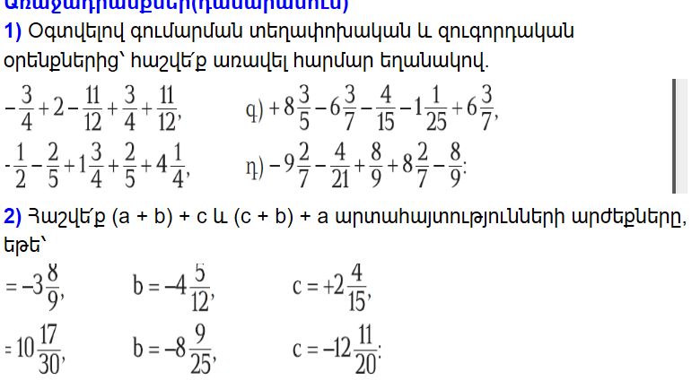 Posted in Uncategorized Դասարանային աշխատանք մաթեմատիկայից։ ՌԱՑԻՈՆԱԼ ԹՎԵՐ Posted on 28 Փետրվարի, 2020 by sardaryanyana 1)-3/4+2-11/12+3/4+11/12=3/7 -1/2-2/5+7/4+2/5+17/4=13/2 43/5-45/7-4/15-26/25+45/7= Share this: Share on X (Opens in new window) X Կիսվել Facebook–ում (Opens in new window) Facebook Like Loading... Related Հեղինակ՝ sardaryanyana View All Posts