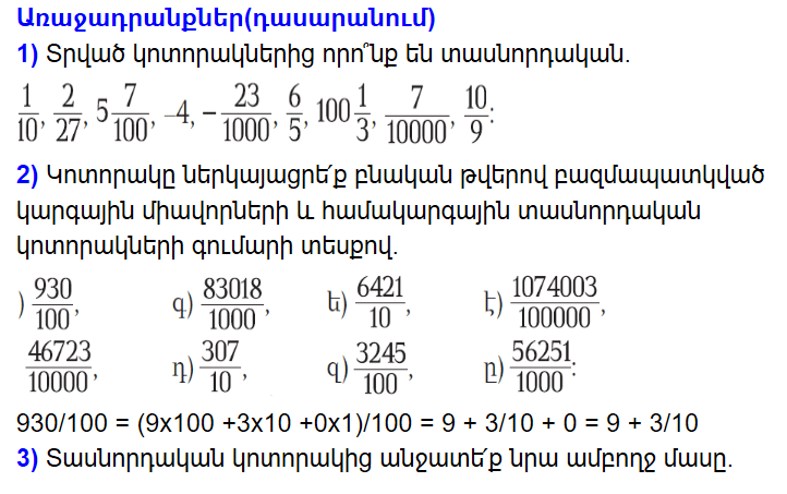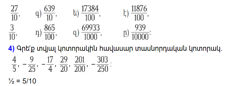 1)1/10-այո, 2/27-ոչ,57/100-այո, -4-այո, -223/1000-այո, 6/5-այո, 1001/3-ոչ, 7/10.000-այո, 10/9-այո։