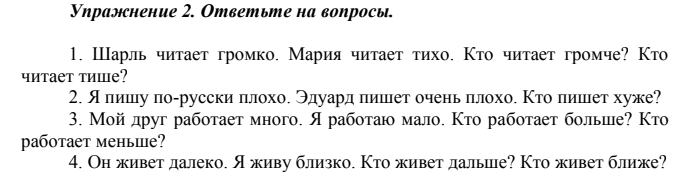 1.Шарль читает громко. Мария читает тихо. Кто читает громче? Кто читает тише?
