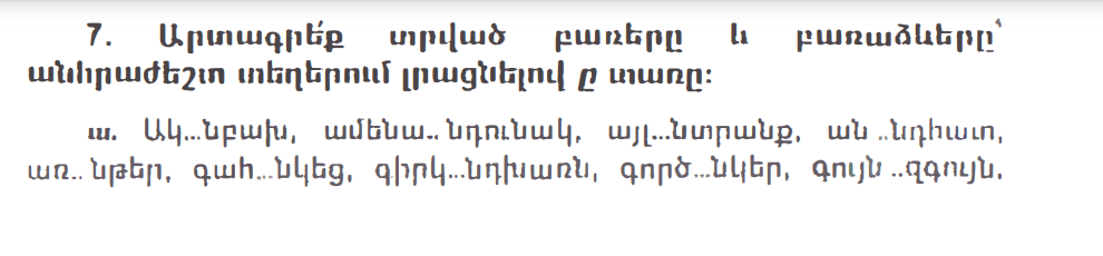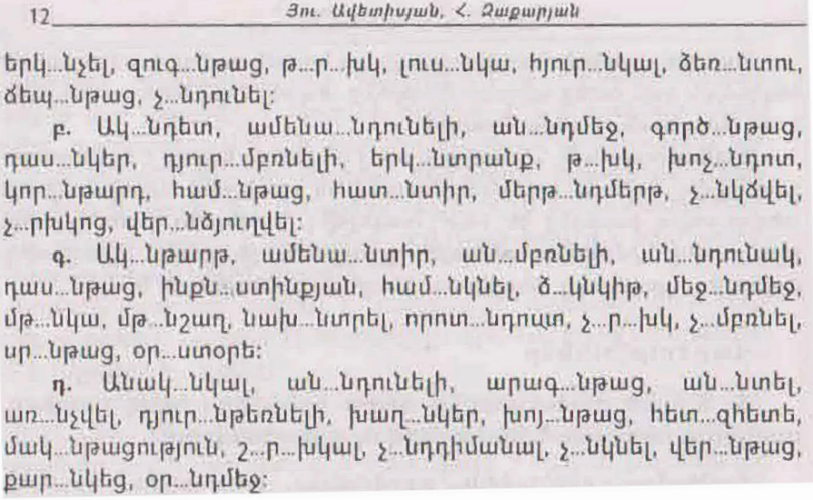 Գ. Խոչընդոտ, անըմբռնելի, օրըստօրե, շրըխկ, նորընտիր, հյուրընկալ, անընդդիմադրելի, տասը