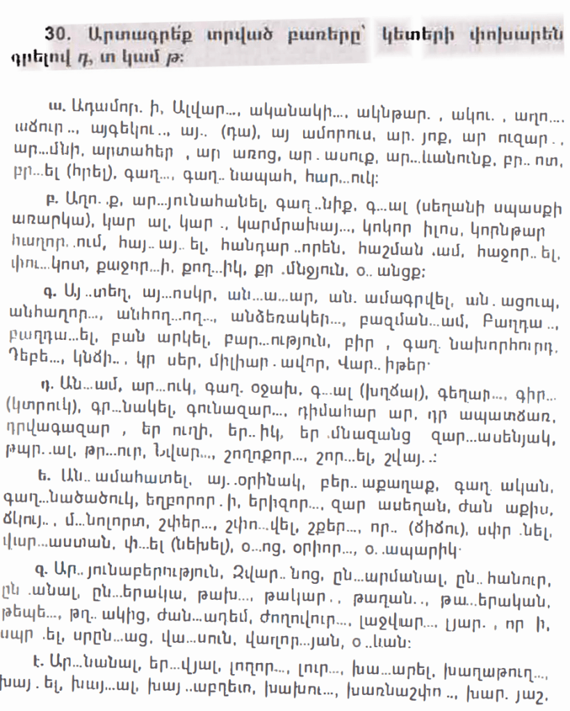 Գ. Այդտեղ, այտոսկր, անդադար, անդամագրվել, անթացուպ, անհաղորդ, անհողդողդ, անձեռակերտ, բազմանդամ, Բաղդադ, բաղդատել, բանտարկել, բարդություն, բիրտ, գաղտնախորհուրդ, Դեբեդ, կնճիթ, կրտսեր, միլիարդավոր, Վարդիթեր։