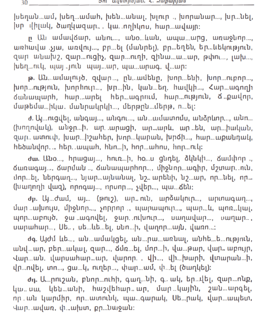 Ժ. Այտուցվել, անգայթ, անգութ, անդամատոմս, անձրևորդ, անոթ /խողովակ/, անջրդի, արդարացի, արդարև, արդեն, արդիական, զարդատուփ, խարտիշահեր, խորտկարան, խրճիթ, հարթաքանդակ, հեծանվորդ, հերթապահ, հնոտի, հորդահոս, հորթուկ։