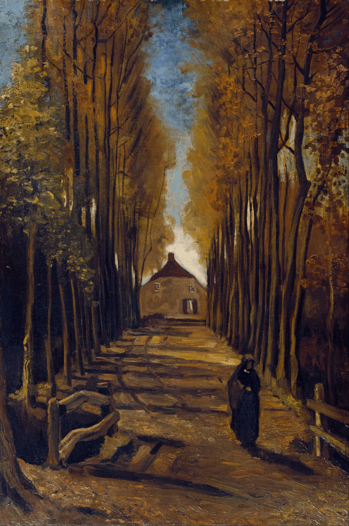 На холсте довольно большого размера Ван Гог изобразил тополиную аллею, уходящую вдаль. Симметричная закрытая композиция создает настроение торжественности и зрительно увеличивает высоту тополей. Ровный строй деревьев выходит к небольшому крестьянскому домику, виднеющемуся в конце аллеи. Справа от дома, на переднем плане, Ван Гог изобразил фигуру неизвестной женщины, одетой в черное платье. Ее грусть усиливает общее настроение печали, которым отличается эта картина.